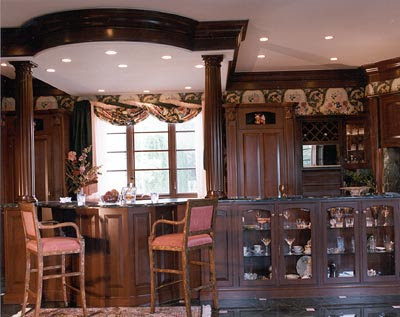 Elegant green marble counters and floors work alongside cream-colored Corian countertops on the lower level of the kitchen island. Rich floral swags and gleaming cherry wood pillars complete the look.